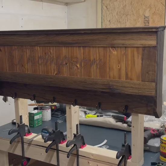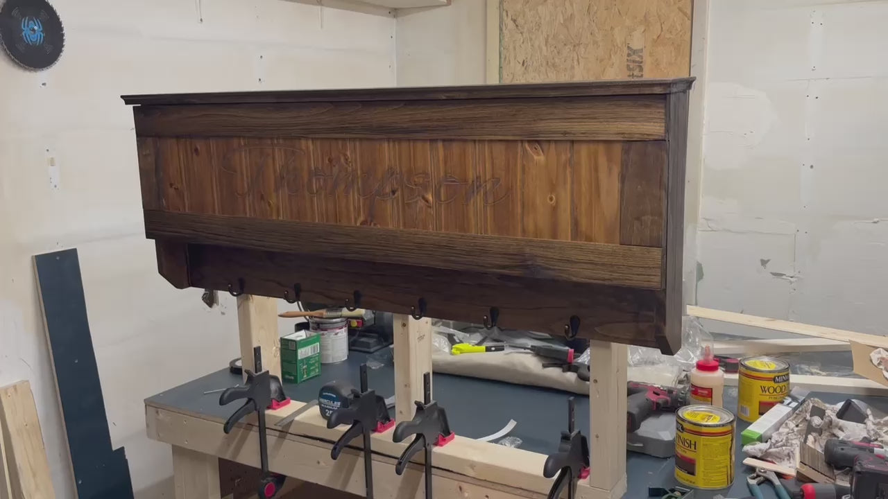 This is a fully customizable concealment coat rack. Comes with up to 3 magnets for firearms, pluck foam insert, 6 coat hooks, RFID lock system. You scan the card or fob, and the cabinet pops open revealing your concealed items. You choose your stain color, and personal engraving for the front door panel.